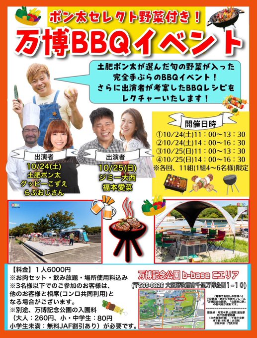 万博公園内のb-baseのバーベキュー会場で、お客さんは完全手ぶらのBBQイベントを行いますっ🥳