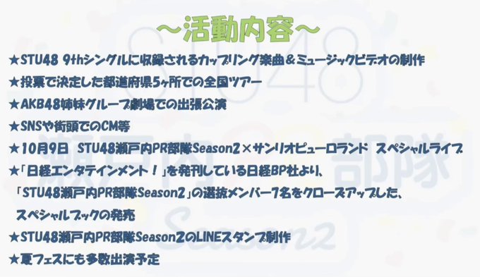 2周年、武道館、瀬戸内PR部隊公演初日、楓卒コン、奈々さんコンなど…