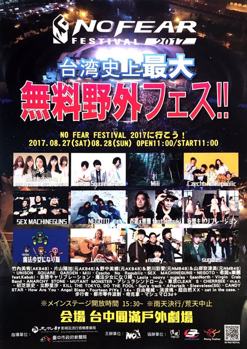 明日は台中市でNOFEARフェス!最終日の大型ステージのトリになります。。初フェス出演、楽しみます〜!ゆるい動画もぜひ見てね☻☆!→facebook.com/NoFearFestival… pic.twitter.com/MxyRfKiC2P