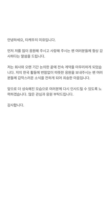 突然のご報告となりますが,私竹内美宥は,長い期間会社と論議し,所属事務所さんとの専属契約を終了する運びとなりました。温かく応援をしてくださっている皆様を驚かせる報告となり,大変申し訳ない気持ちです。今後も皆さんの応援を糧に精進して参ります。これからもよろしくお願いします。