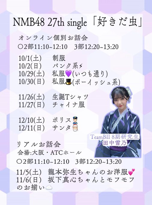 田中雪乃【NMB48】@tanaka_yukino48 -- オンライン・リアルお話会の服装が決まりました!!まとめて作ったつもりやけど見にくいかもです💦#NMB48 #オンライン個別お話会 #リアルお話会 #お楽しみに💜 #田中雪乃 pic.twitter.com/4fmFmG78WE ☻ 芳野 心咲 ☻@_Misaki_Yoshino -- @tanaka_yukino48 ゆきのチャイナみたいなみたいな🍀