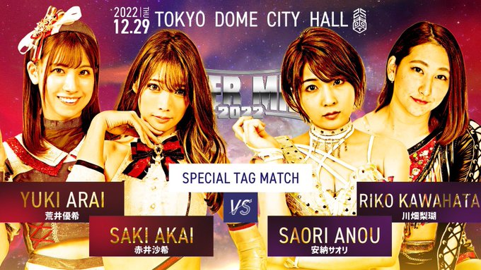 参戦させていただく、DDT 12月29日TDCホール大会のカードが決まりました!!安納サオリ選手川畑梨瑚選手と対戦!初めて尽くしでドキドキですが最高な2022年の締めくくりになるように頑張ります!!DDTさんのリングで赤井さんとキラキラするぞ〜😊✨