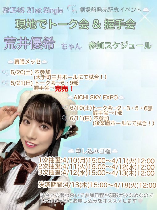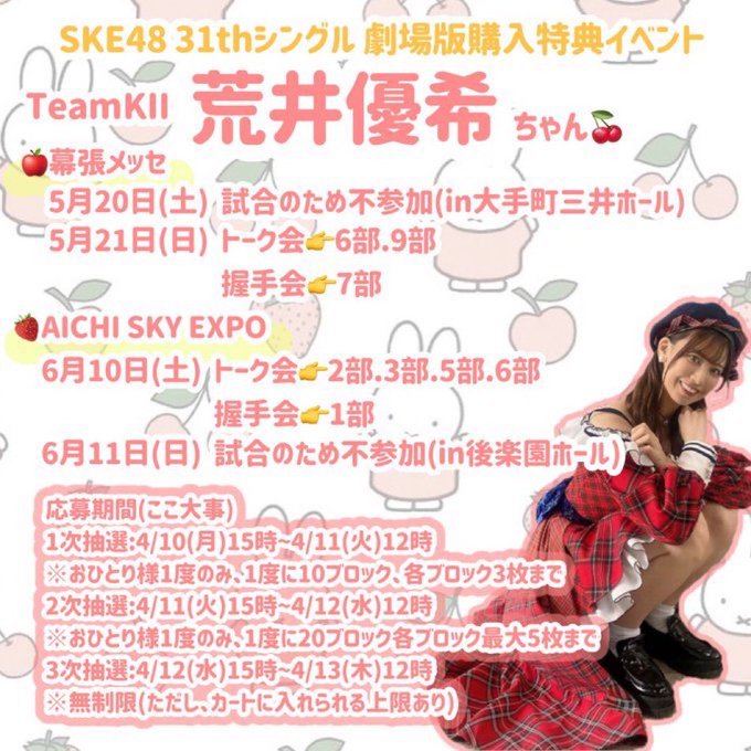 荒井優希@araiyuki57 -- このあと12時で締め切り!忘れてないー??🫠 twitter.com/araiyuki57/sta… 荒井優希 握手会決定🫶✨トーク会もあるよ🤞関東1日、名古屋1日の参加です!関東は特に少ないので早いうちにゲットしてね💭みんなに会えますように!😊来てくれる人ー??🙋🏻♀️ここから💌👇shop.mu-mo.net/st/special/ske… twitter.com/ske48official/… pic.twitter.com/V094Imwsss