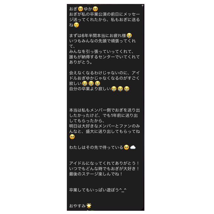 本当に本当に私も大好きだよ。どんな時もそばにいてくれてありがとう。ゆかちゃんの優しさにたくさんたくさん救われました😭そして、みんなのことを書いてくれてありがとう。今日はゆかちゃんとゆかちゃん推しの皆さんにとって素敵な卒業公演になりますように!!! twitter.com/yuka_ippaiwara…
