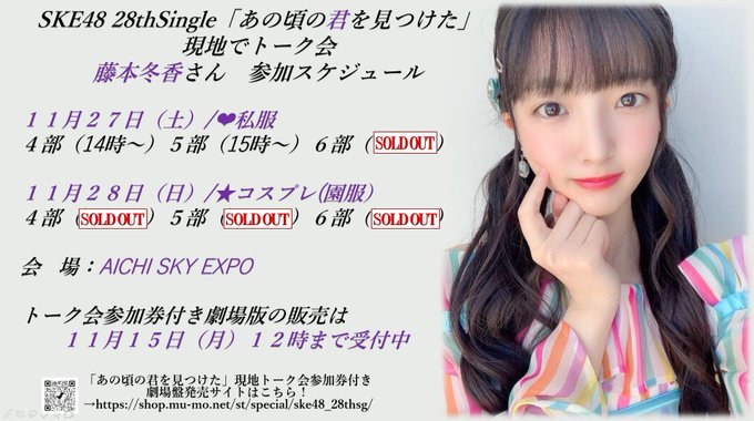藤本冬香(SKE48)@fuyuka0403 -- 残すところ11月27日の4と5部のみです!このシングル最後のトーク会よろしくお願いします🥺shop.mu-mo.net/st/special/ske…↓ファンの方ありがとうございます🌷 pic.twitter.com/HvGF1U9ZX7