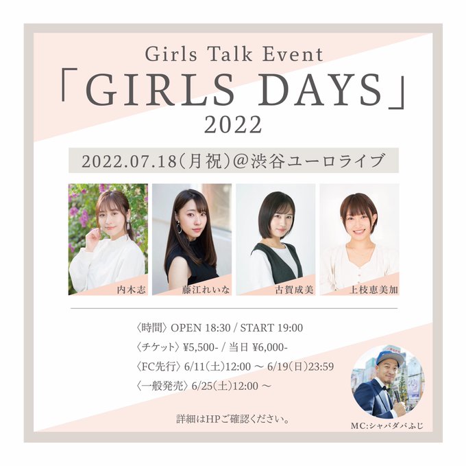 藤江れいな@nya_n017 -- よろしくお願いします🥺 twitter.com/route017/statu… 藤江れいなファンクラブ「Route 017」公式 【EVENT】 7/18(月・祝)「Girls Talk Event「GIRLS DAYS」2022 チケット一般販売URLreina-fujie.jp/content1?no=we…明日、6/25(土)正午12時より一般販売開始です。どなたでもご購入頂けますのでよろしくお願い致します! pic.twitter.com/0obx2hCkBy