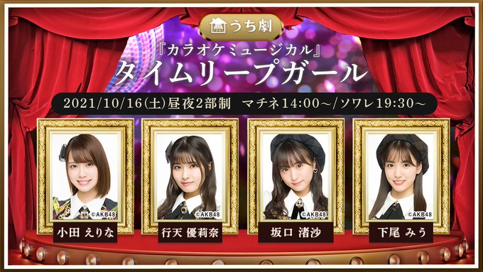 行天優莉奈@tenten_yurina -- わー!ドキドキ💓ぜひ見てね😊 twitter.com/akb48_staff/st… AKB48公式 2021/10/16(土)上演のうち劇「『カラオケミュージカル』タイムリープガール」に、チーム8から #小田えりな #行天優莉奈 #坂口渚沙 #下尾みう の出演が決定😍👏💘ぜひご覧ください👀🌟▼詳しくはこちらameblo.jp/akihabara48/en… pic.twitter.com/ckrpUeU7Ia