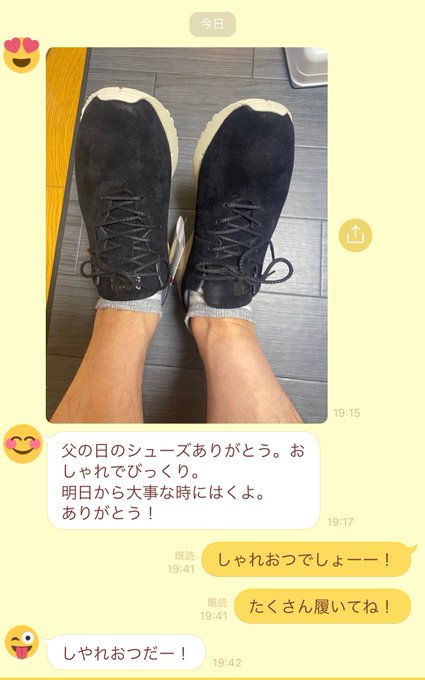 父の日が近いのでお父さんにスニーカーをプレゼントして送ったら反応がとてもかわいかった😂しかも絶対部屋の中で履いてるよね🙃