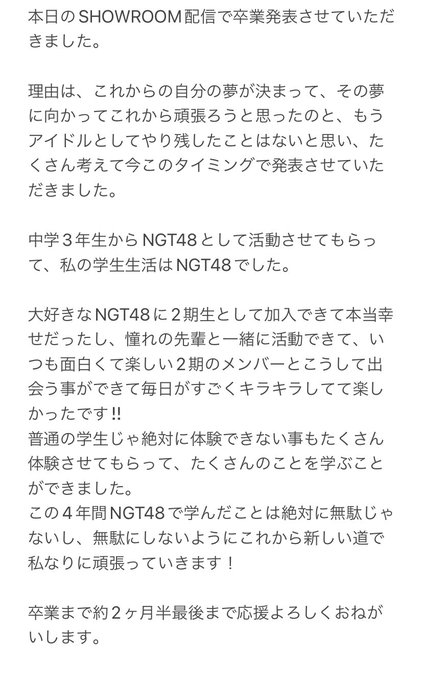 西潟 茉莉奈@marina_ngt48n -- てらひな...😭😭😭寂しい😭😭😭 twitter.com/hina_terada/st… 寺田陽菜 卒業発表させていただきました。最終活動日は7月末までとなります。卒業まで約2ヶ月半応援よろしくお願いします。 pic.twitter.com/ZqfOoFGXNA