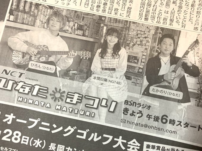 角ゆりあ@kadochan062218 -- もう少し!!お聴き逃しなく!ひなた頑張れ〜! twitter.com/hinata_fes_bsn… ひなたまつり いよいよ『#ひなたまつり』初回放送日となりました🎉 #BSNラジオ で18時スタート。23時からはNCTのコミュニティチャンネル(エリア外の方は無料アプリ NCTコネクト)でTV放送もあります。今朝の新潟日報紙面に、お知らせを掲載しております☀️#ひなた @HinataLive #本間日陽 @hinata_homma #NGT48 pic.twitter.com/fV3DddA1w5