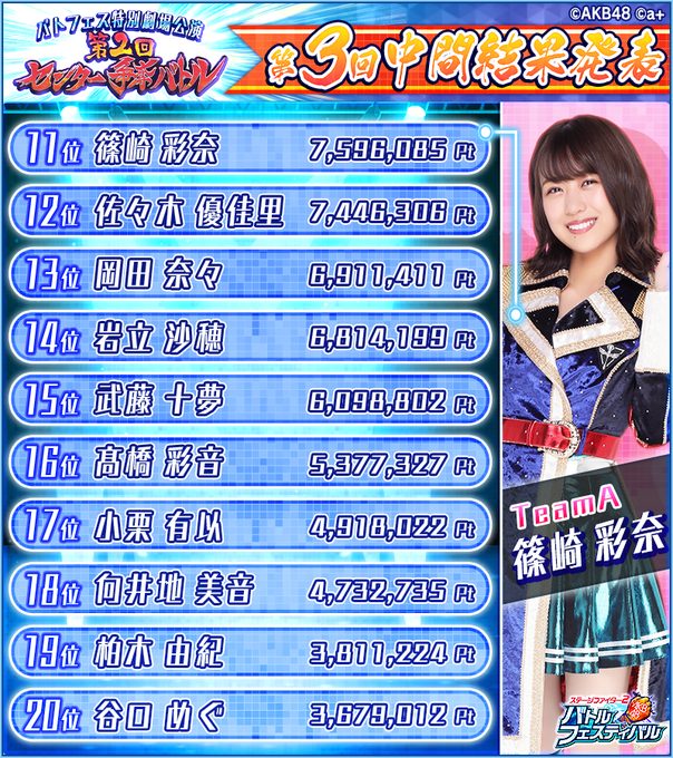 谷口めぐ@o_megu1112 -- 20位ありがとうございます🙇♂️✨ twitter.com/akb48_battlefe… バトフェス(バトルフェスティバル) ✨『第2回センター争奪バトル』第3回中間結果発表✨11位~20位の中間結果はコチラ🎉選抜入りまであともう一歩💕ここから追い上げましょう❗コーチ❗#AKB48 #バトフェス #センター争奪バトル pic.twitter.com/7R3X0KXBRS