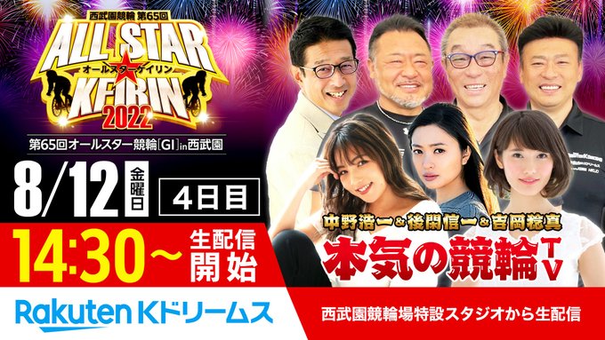 Kayo Noro 野呂佳代@kayopone -- 14:30 あと3分後出演します!見てください!! twitter.com/kdori_now/stat… 楽天Kドリームス(競輪投票・LIVE) #西武園競輪 #オールスター競輪 GⅠ#4日目#本気の競輪TV🔥14:30~生放送📺 /youtu.be/KKf5uXzx3Z4\🔽出演 #中野浩一 #吉岡稔真 #後閑信一#野呂佳代 @kayopone📖買い目提供 #後閑百合亜 #金川光浩 🚴🏻♀️出走表keirin.kdreams.jp/seibuen/raceca…⭐keirin.kdreams.jp/graderace/alls…⭐#楽天Kドリームス #競輪 pic.twitter.com/7OMw924Iy5