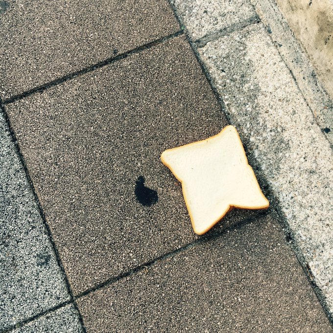 鎌田菜月@nacky_k829 -- 歩道に謎の食パンが現れた!!▷拾う▷食べる▶︎放置→鎌田はさすがに放置した曲がり角でもないないのに!!勿体無かった!!それが今日1の心残りです!!!おやすみなさい!!!! pic.twitter.com/BuILg5A34z
