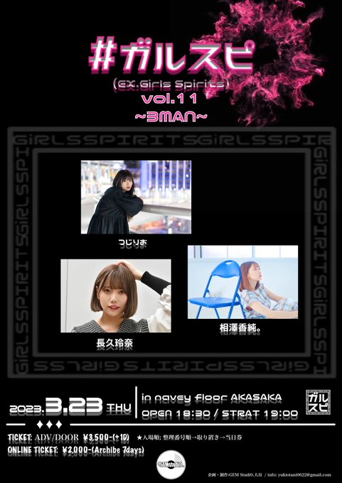 長久玲奈@__cho__kurena -- 出演させていただきます!いつもより少し長めの演奏時間なので、お楽しみに😊お待ちしております! twitter.com/chokurena_staf… 長久玲奈スタッフ LIVE情報🐼3/23(木) @naveyfloorAKASAKA【#ガルスピ vol.11 3MAN】 出演: 相澤香純。/ つじりお / 長久玲奈●OPEN/START 18:30/ 19:00●会場TICKET ¥3,500(D別) tiget.net/events/2301432/24(金)22:00~●配信TICKET ¥2,000(アーカイブ1週間) twitcasting.tv/c:bluemy0108/s…即日販売開始 pic.twitter.com/wUv075Tyo8