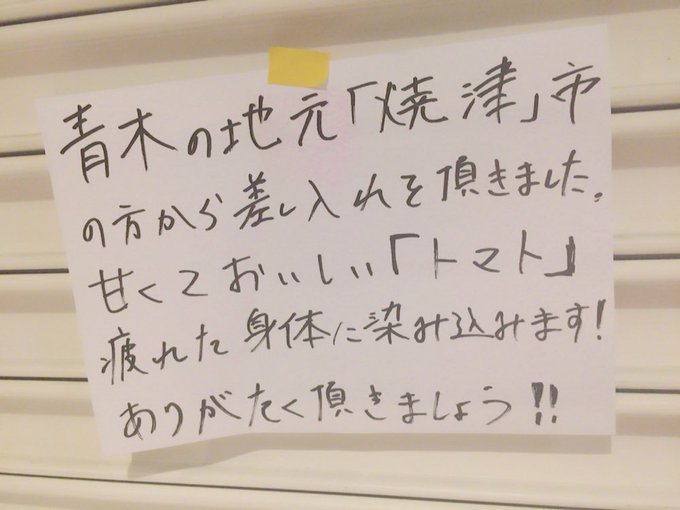 青木詩織(おしりん)@oshirin_dayo -- 元気がモリモリ湧いてくる差し入れをいただきました!✨ありがとうございます😋コンサート頑張ります!!!#焼津 #アメーラトマト pic.twitter.com/FTNTipTerM