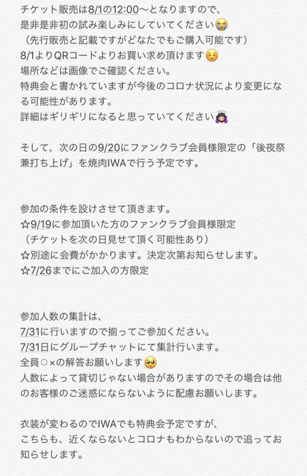 飯野 雅@miyabi_ichigo15 -- 皆さんぜひ参加して頂けると嬉しいです🤤👍🏻 twitter.com/miyabi_ichigo1… 飯野 雅 〜お知らせ〜この度、9/19に23rd 飯野雅生誕祭First Liveを開催することになりました🤤💗詳細や場所などは下の画像からご確認ください👍🏻そして、後夜祭兼打ち上げを9/20にIWAで行います!そちらは参加に条件がありますので画像ご確認ください🙇🏻♀️コロナの状況があるのでその都度お知らせします😭 pic.twitter.com/cghfNfowE4