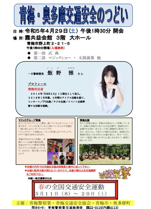飯野 雅@miyabi_ichigo15 -- 今日は制服の試着を。引き締まりますね! twitter.com/miyabi_ichigo1… 飯野 雅 🚨お知らせ🚨日程:4/29(土)青梅市の一日警察署長をさせて頂きます👮🏻!(やっと言えたぁぁぁぁぁ!!)入場料は無料なので皆様是非来てくださると嬉しいです🫶🏻✨この日の夜は舞台本番もあるので一日中一緒です!笑待ってるよ〜🥰行くよ報告お待ちしてます☺️ pic.twitter.com/P3QgssLfzY