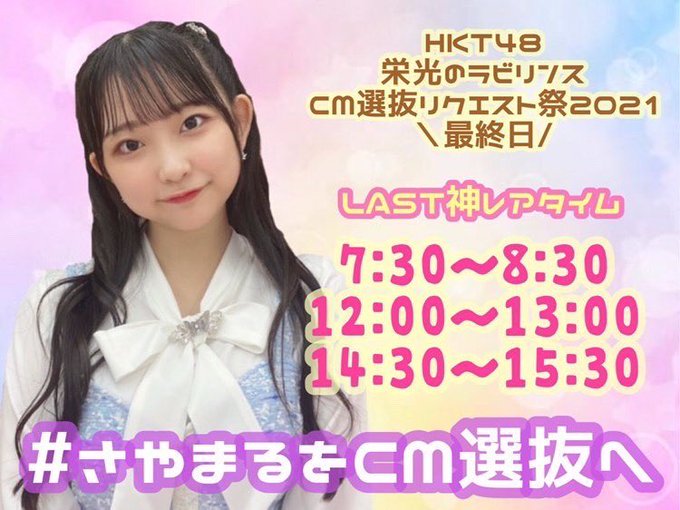 馬場彩華@symr_hkt -- 長い間ありがとうございました🥲\リクエストの受付は、明日(7/14)のAM11:59まで/です!受け取りBOXとか全部確認してから忘れずにリクエストしてくれると嬉しいです🙌🏻 twitter.com/hkt48aiia/stat… HKT48 栄光のラビリンス 広報 イベント「CM選抜リクエスト祭2021~決勝~」の開催が終了いたしました。多くのユーザー様にご参加いただき、誠にありがとうございました!リクエストの受付は、明日(7/14)のAM11:59まで、となります。リクエストランキングの最終結果は、明日(7/14)17:00に発表いたします。