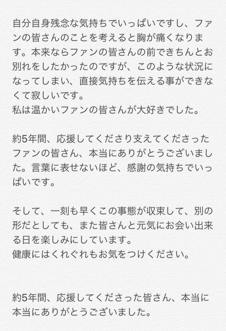 公式でも発表があった通り、5月に延期していた卒業公演が中止ということとなりました。 pic.twitter.com/4ubPlsHf4a