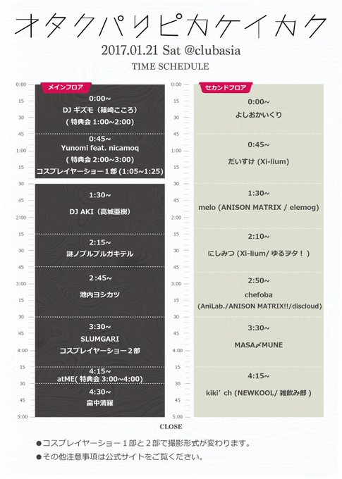 高城亜樹 🎧DJ AKI@AKI_WISMALU -- 私は1:30頃からです☺✨あと3日だ!楽しみ♩ twitter.com/o_paripika/sta… オタクパリピカケイカク@1/21 タイムテーブル公開!!ライブも、DJもヤバい、レイヤーショーもまじでヤバい。オープンからテキーラメイド喫茶Carnival☆Starsも待ってます!1月21日 (土) #オタクパリピカケイカク !チケットはココ!!→ sort.eplus.jp/sys/T1U14P0010… pic.twitter.com/ec6EuDAklc