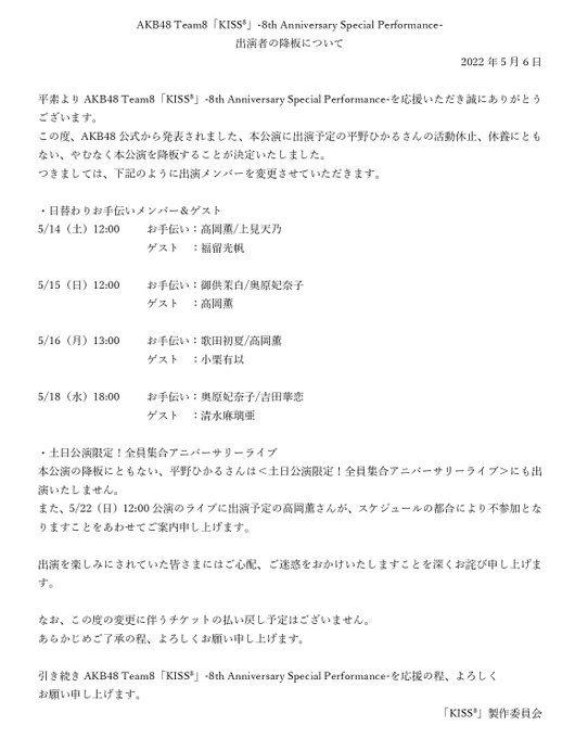 高岡薫(AKB48)@runsan_himeme -- 変更が発表されました。よろしくお願いします。 twitter.com/kiss8_team8/st… 「KISS⁸」(キスバイエイト)【公式】 【公演についてお知らせ】平野ひかるさんの活動休止、休養にともない、やむなく本公演を降板することが決定いたしました。詳細は添付をご確認ください。出演を楽しみにされていた皆さまにはご心配、ご迷惑をおかけいたしますことを深くお詫び申し上げます。#AKB48#チーム8#KISS8 pic.twitter.com/zpiGueTxfF