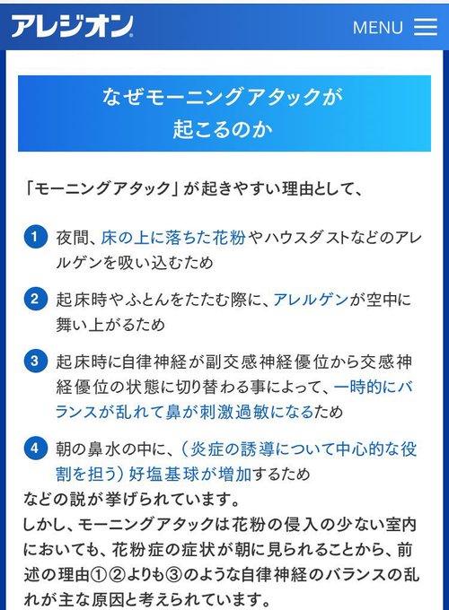 花粉症の人なら共感してくれると思うんだけど、寝起きやたらくしゃみ連発しません?あれ【モーニングアタック】って言うんだって、知ってた?今日朝20連発くらいして思い出した。朝からくしゃみ連発はもう、1日の力使い切るくらい疲れる、それにしても、モーニングアタックってネーミングセンスな✋😇 pic.twitter.com/SmrfTiSiXW