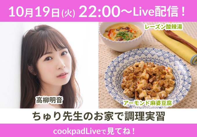 高柳明音@akane29_o8o -- まもなく〜😋お腹すいた twitter.com/cookpadtv_live… cookpadLive 【いよいよ明日】10/19(火)22時~ 高柳明音さんの「ちゅり先生のお家で調理実習」を配信🎉ゴールド会員限定のスペシャルTIMEもお楽しみに✨cookpadLiveをDLしてご覧ください❗️cookpad.tv/episodes/13328 #高柳明音 #cookpadLive pic.twitter.com/E0xFi41I4n