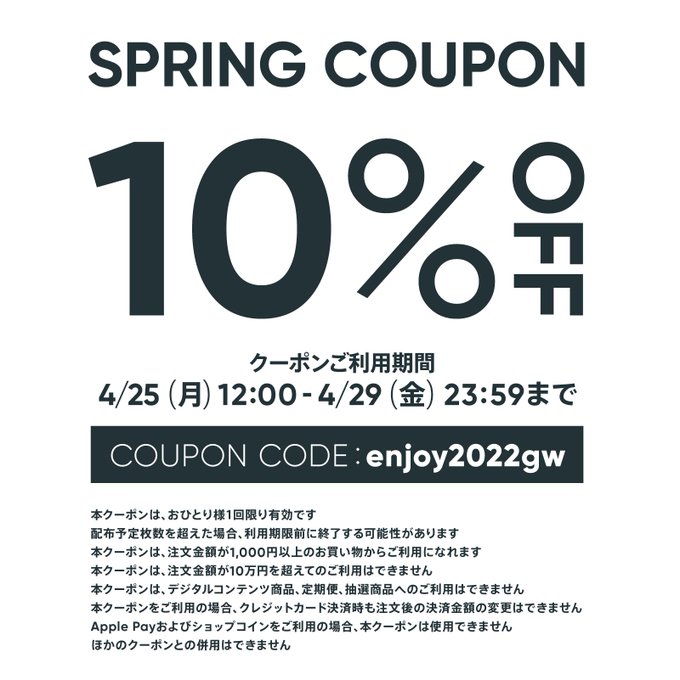 本日よりクーポンコード「enjoy2022gw」を入力していただきますと10%offになります◎
