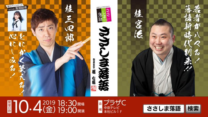 高畑結希(SKE48)@takahatayuki718 -- #ささしま落語いよいよ明日です😊✨東西対決楽しみです!!!一度来たら必ずハマると思います♪私はそれでした😁当日券もあるのでぜひ遊びに来てくださいね💙 twitter.com/sasashimarakug… ささしま落語 10月4日 19時「ささしま落語 開催です!」今回は、東西の若手落語家が、ささしまで対決!!東方 桂 宮治 vs 西方 桂 三四郎二人の対決を見守る女神は、SKE・髙畑結希当日券もまだ有ります。皆様のお越しお待ちしております。ctv.co.jp/event/sasashim… pic.twitter.com/sFXqeMU5pI 日高優月(SKE48)@iamyuzuki_k2 -- @takahatayuki718 頑張れはたごん〜〜😚🎶 高畑結希(SKE48)@takahatayuki718 -- @iamyuzuki_k2 優月さん。。。🥺💙ありがとうございます!