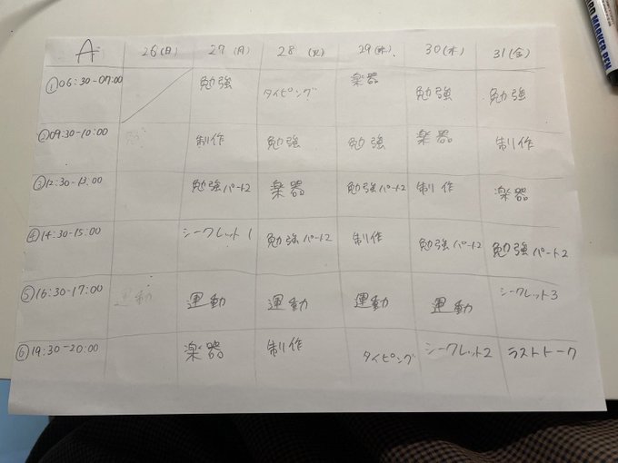 明日は基本タイムスケジュールAで①勉強②制作③勉強Part2④シークレット1⑤運動⑥楽器の予定です!!