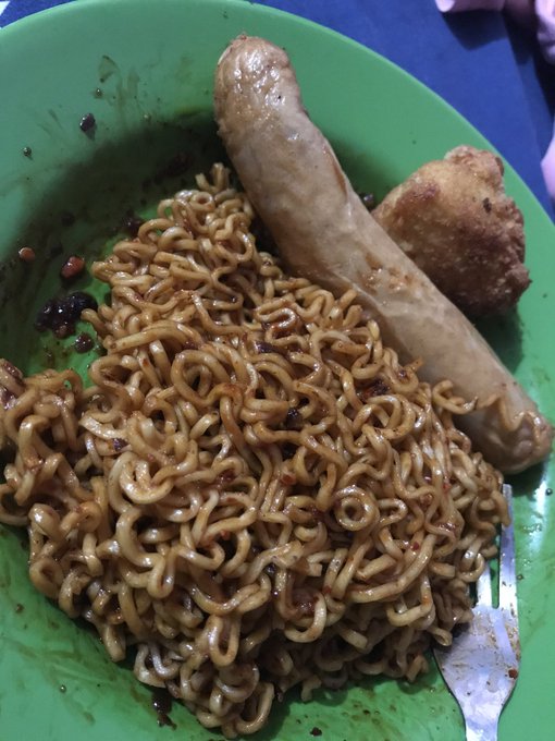 Makanan simple klo masak sendiri mie pedes pke sosis dan nugget 😍