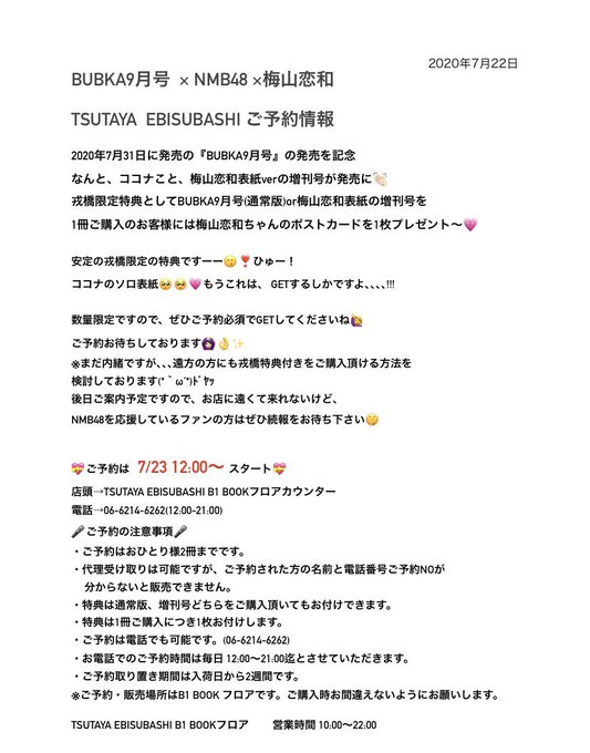 梅山恋和🍡NMB48@cocona_umeyama_ -- 本日の12時より予約開始してます〜✨🤍 twitter.com/t_ebisubashi/s… TSUTAYA EBISUBASHI 【B1 BOOKフロア】7/31(金)発売 #BUBKA 最新号当店限定特典は#NMB48 #梅山恋和 ちゃん😍😍しかもココナ表紙verも❗️表紙は大人ココナ💄ポストカードは夏祭りココナ👘甚兵衛ココナと夏祭りデート❤️可愛すぎでしょ‼️予約は明日12時から✨#もっちもちサマー2020#だってだってだって pic.twitter.com/83ys3WdARf