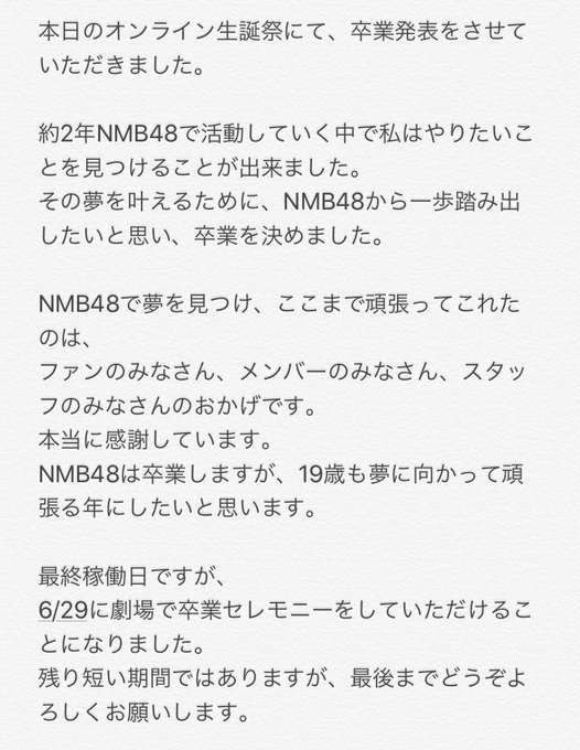 面白くて素敵なNMB48だいすきです!最後まで頑張るのでよろしくお願いします! -