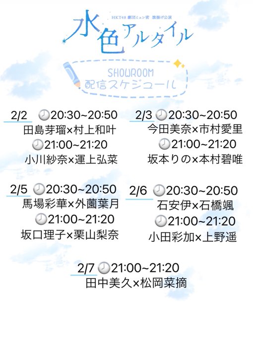 小川 紗奈@sana_o_0620 -- ひろなさんとだよ〜🤍🤍嬉しい...!! twitter.com/gekihaji_myun/… 『水色アルタイル』公式 /#水色アルタイル 🏫☁️ SHOWROOMコラボリレー配信決定✨\SHOWROOMにて #ミュン密 メンバー同士のコラボ配信が決定しました🎉ペアはあみだくじで決まりました🗳!色んな役職同士の裏話など聞けちゃうかも〜?是非ご覧ください💕😊スケジュールはコチラ▼ pic.twitter.com/1rh28xThg5