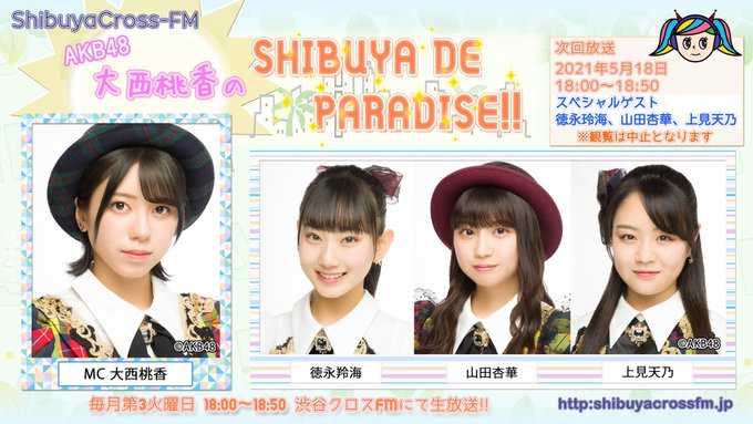 上見天乃(AKB48)@Uemi__Sorano -- すっごく楽しみです✨✨みなさんぜひ聴いてください💗 twitter.com/428_de_paradis… 【公式】AKB48 大西桃香のSHIBUYA DE PARADISE‼︎ AKB48 #大西桃香 のSHIBUYA DE PARADISE‼️次回5/18 18:00〜#渋谷クロスFM から生放送❗️SPゲスト#徳永羚海 さん#山田杏華 さん#上見天乃 さんスタジオ観覧につきましては、中止とさせて頂きます🙇♀️ご視聴は下記webサイトよりお願い致します📻⬇️配信はこちらshibuyacrossfm.jp pic.twitter.com/wKcPRqNz1b