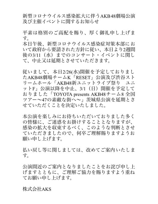 2/28のユニットH「AKB48新ユニットライブ祭り」も中止になりました。