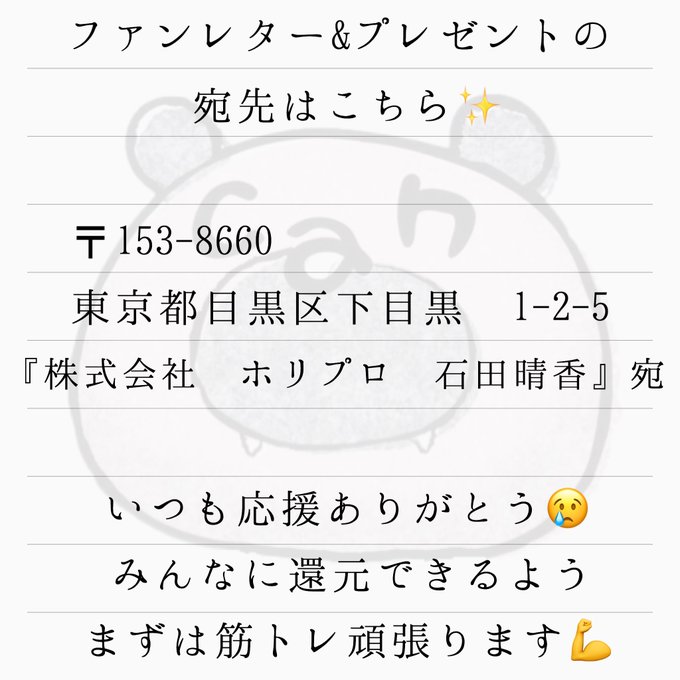 石田晴香@はるきゃん@can2525can たまにファンレターの宛先を聞かれたりするので載せておきます!