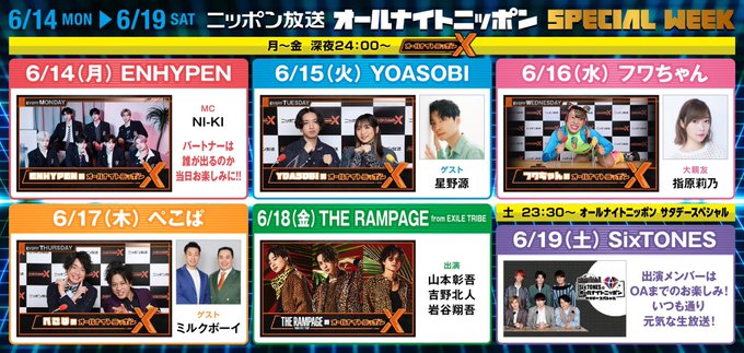 指原 莉乃@345__chan -- 🏃♂️📻 twitter.com/ann_since1967/… オールナイトニッポン 再来週のANNXとサタデーSPはスペシャルウィーク!14日(月)#ENHYPENANNX #NI_KI15日(火)#YOASOBIANNX × #星野源 #星野源ANN 16日(水)#フワちゃんANNX × #指原莉乃 17日(木)#ぺこぱANNX × #ミルクボーイ 18日(金)#THERAMPAGE#山本彰吾 #吉野北人 #岩谷翔吾#RMPGANNX19日(土)#SixTONESANN pic.twitter.com/b6oamjiFsu