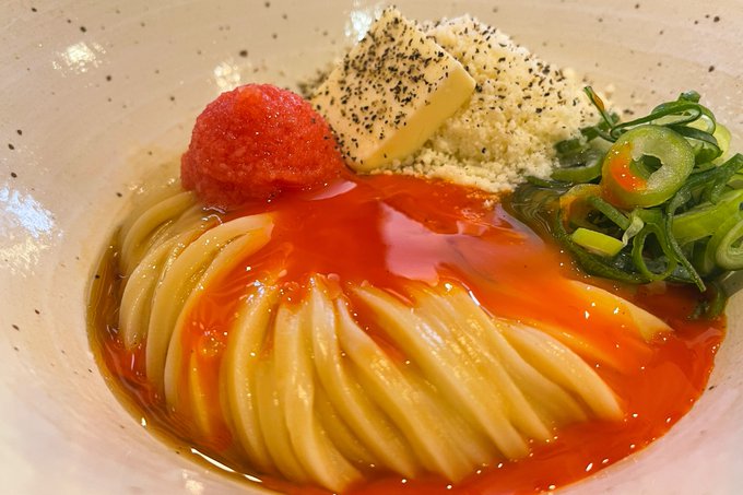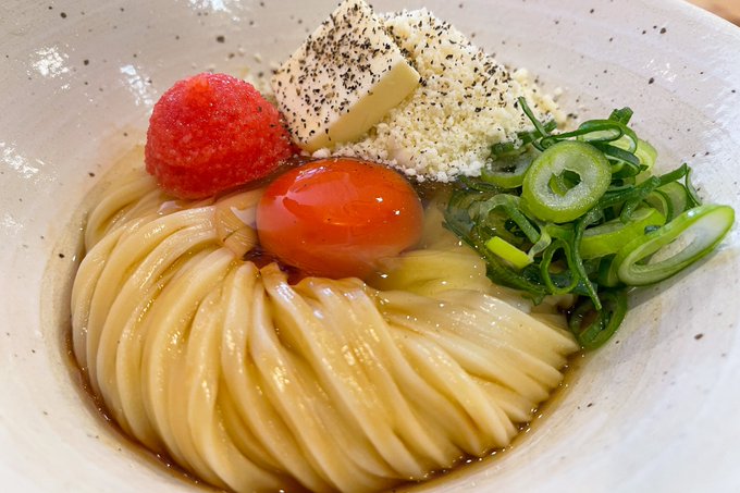 釜玉めんたいバターチーズうどんを食べられるお店。