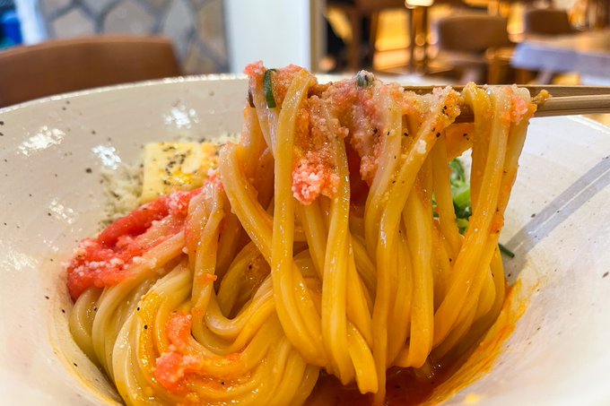 綺麗に巻かれたモチモチ麺に卵黄とチーズ、バターを絡ませればカルボナーラ風に楽しめます!明太子を絡ませても美味!