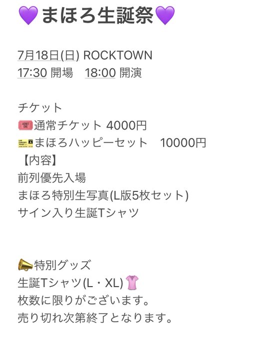 沖田彩華@ayaka1o11 -- 生誕T可愛いですね😌💜まほろのお祝い✨盛大にしましょう❤️🔥❤️🔥 twitter.com/fancy_0417/sta… FanCy- 7月18日 (日)田中まほろ生誕祭(仮)チケット予約はこちらから✨tiget.net/events/136439 本日21時〜予約スタート💜詳しくは下記の画像をご覧ください🙇♀️チケットが2種類ございます。申し込みの際に必ずどちらかをお選びください。ハッピーセットの生写真はまほろの写真のみになります。 pic.twitter.com/iYS7EUffmS