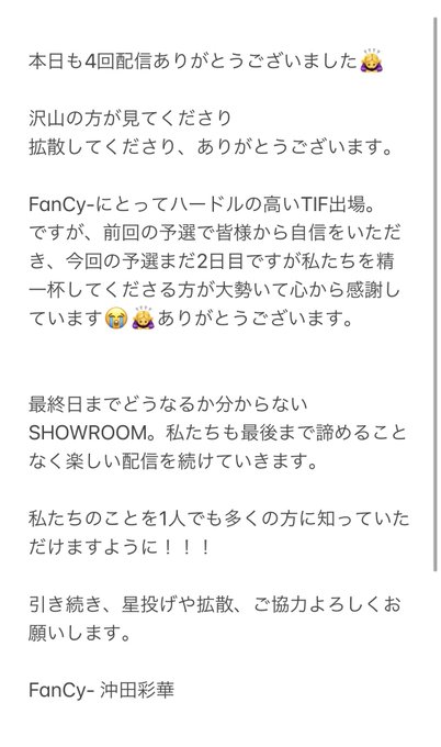 沖田彩華@ayaka1o11 -- 初見さんも沢山きてくださり朝から賑わっていた明るいルームでした🙇♀️✨まだ7位!TIF出場は6位以内!次は13時〜配信します🙇♀️✨ twitter.com/fancy_ayaka/st… 沖田彩華 (サブです) 応援ほんとうにありがとうございます🙇♀️❤️次は12時15分に星捨て13時〜配信よろしくお願いします🙇♀️ pic.twitter.com/74a12B3CNy