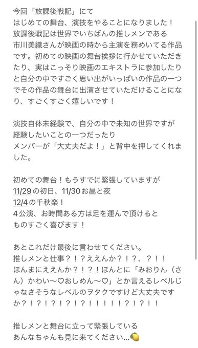 この度、舞台「放課後戦記」に出演させていただくことになりました!初めての舞台!はやく発表したくて仕方なかった〜!推しメンである市川美織さんと同じ舞台!もうすでに緊張しています!