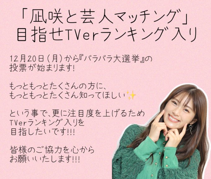 凪咲さんの冠番組、#凪咲と芸人マッチング に投票よろしくお願いします🙏🏻🌼 twitter.com/barabaratvasah… pic.twitter.com/FTvonxrdy8
