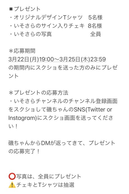 磯佳奈江@isokana89 -- いそさら1万人特別企画 プレゼント🎁✨詳細はこちら💁🏻♀️!youtu.be/VASdy47SdBU pic.twitter.com/JAxnSCsAw0 磯佳奈江@isokana89 -- たくさんの応募ありがとうございました☺️当選された方には後日ご連絡致しますので、お待ち下さい!これからもいそさらよろしくお願いします💖