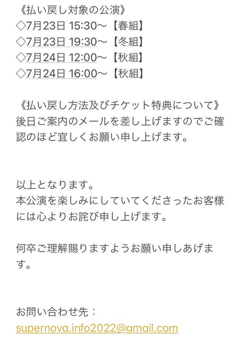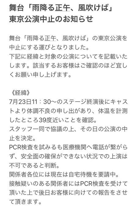 久代梨奈@Rina_Kushiro_ -- 舞台「雨降る正午、風吹けば」東京公演中止となりました。公演についてのお知らせです。引用先をご一読ください。よろしくお願いいたします。#雨降る正午2022 twitter.com/supernova_stag… SUPER NOVA【劇団公式】 舞台『雨降る正午、風吹けば』【東京公演中止のお知らせ】公演を心待ちにしてくださっていた皆様には深くお詫び申し上げます。今後の対応については現在協議中となります。追ってご報告致します。ここまでご来場くださったお客様には心より感謝致します。#雨降る正午2022 pic.twitter.com/EB01vWjf1h