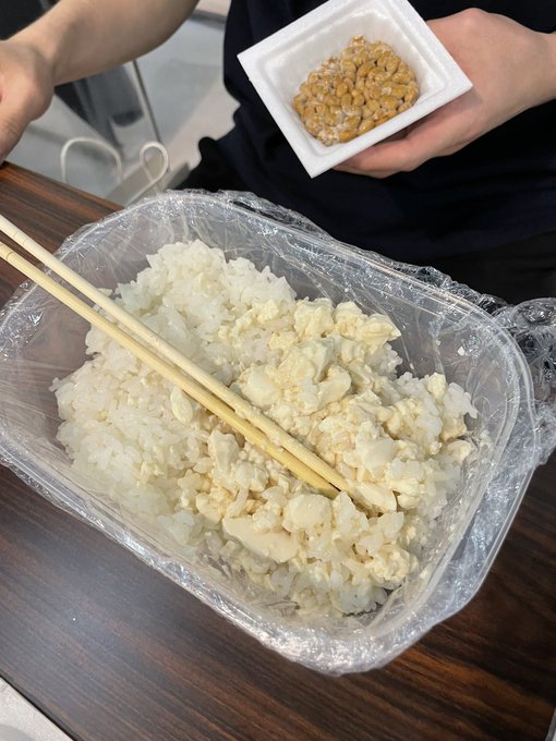 各々が様々なお弁当を持ち寄る中で、唯一の同い年である雄大さんは、白飯に豆腐を掛けて食べてました。