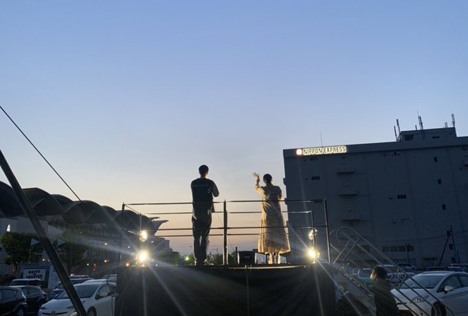 ハッピーメールを福岡のドライブインシアターで今、上映させて頂いてます。ご挨拶させていただきました!!皆さんがワイパーや、車のライトで応答してくださって😭