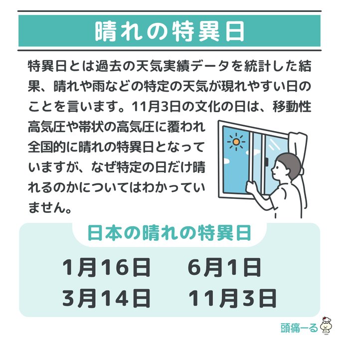 そのほか1月16日、3月14日、6月1日が晴れの特異日となっています。 pic.twitter.com/0W8XikXwF6