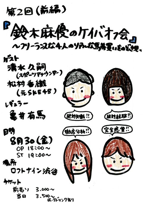 松村香織@kaotan_0117 -- 8月30日19時〜渋谷ロフトです🥺ぜひ遊びに来てください🥰eplus.jp/sf/detail/3045… twitter.com/mayupinkro/sta… 鈴木麻優 【拡散希望】オフ会、チケットですが、かなり余っております💦💦 積極的に遊びに来てくださるとたすかります!🙏マニアックな馬券買いをする出演者揃ってます😂😂アツい夏にしようぜ★#清水久嗣#松村香織#亀井有馬#ちお前編eplus.jp/sf/detail/3045…後編eplus.jp/sf/detail/3045… pic.twitter.com/VXRCKcBkPY